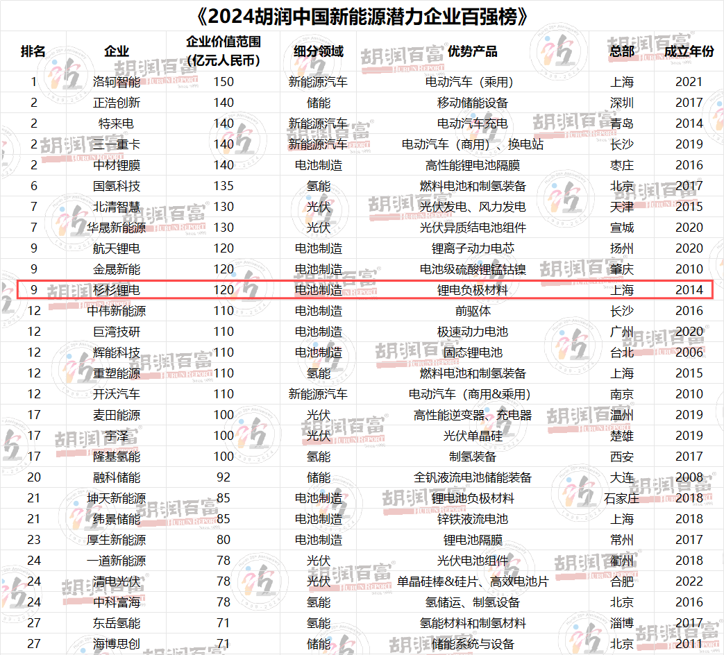 胡润研究院作为世界知名的财富研究机构,其发布的榜单在业界具有较高的权威性和影响力。《2024胡润中国新材料企业百强榜》列出了中国新材料领域最具价值的非国有企业。《2024胡润中国新能源潜力企业百强榜》列出了成立于2000年后,企业价值在10亿元至150亿元人民币之间,中国新能源领域最具发展潜力的非上市企业,按照企业估值进行排名。