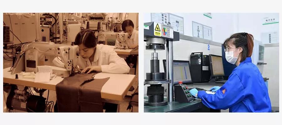 左图:1998年女员工在传统缝纫机前埋头苦干 右图:2019年技术人员在精密设备前从容操作